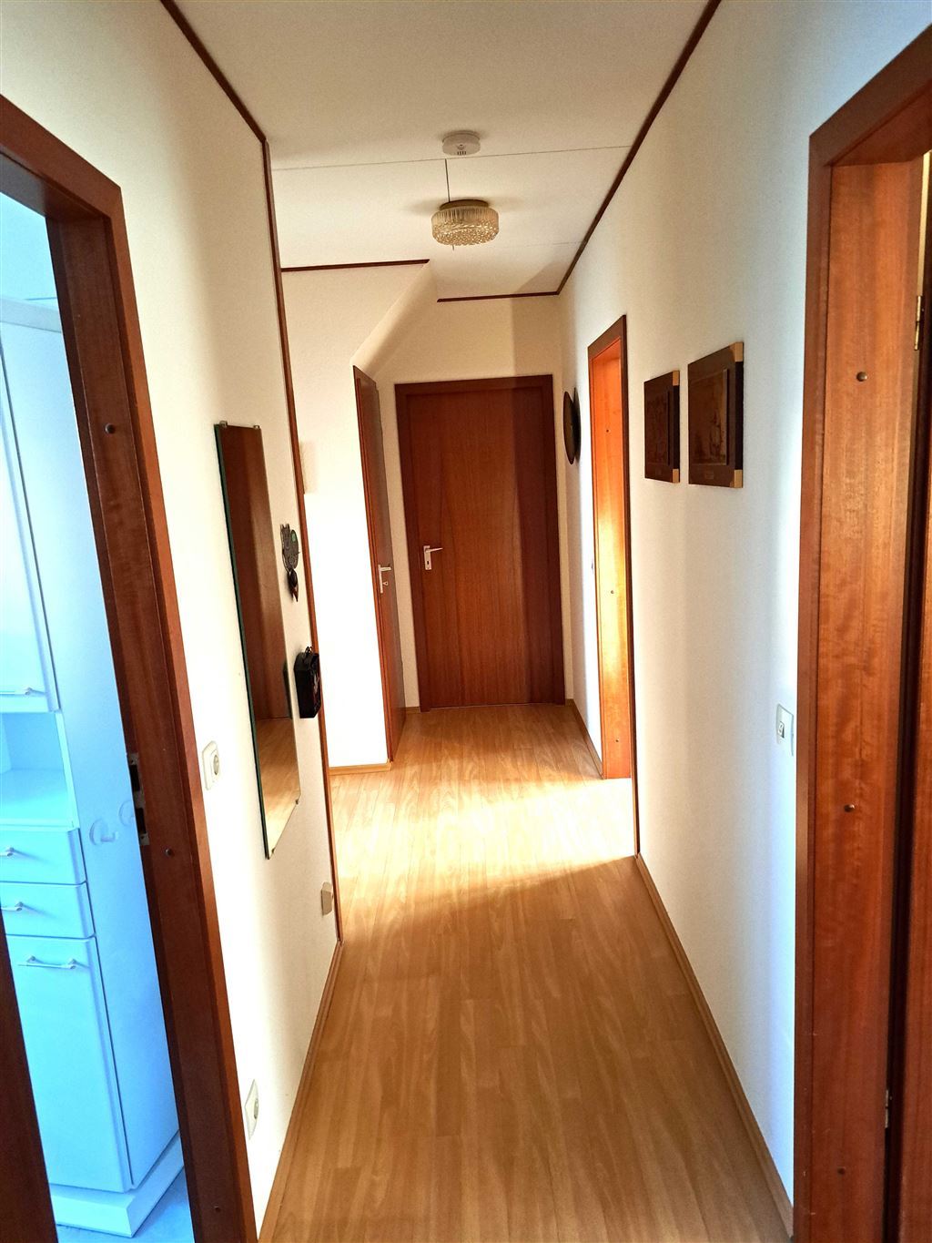 Von hier aus gelangen Sie über einen weiterführenden Flur zentral in alle Räumlichkeiten des Erdgeschosses. Im rechten Teil kommen Sie dann zum Schlafzimmer (mit Zugang zum Balkon) und einem weiteren Kinderzimmer. Auf der gegenüberliegenden Seite zeigt sich das Wannen-und Duschbad mit Tageslicht.